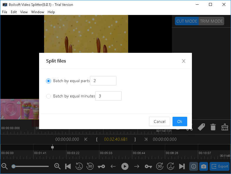 Если вместо ручного выделения нужно автоматически разбить ролик, используется кнопка разбиения на равные сегменты. После этого Boilsoft Video Splitter открывает окно Split files, в котором доступны два варианта: Batch by equal parts и Batch by equal minutes. Первый вариант делит видео на заданное количество частей, второй — на куски одинаковой длительности.