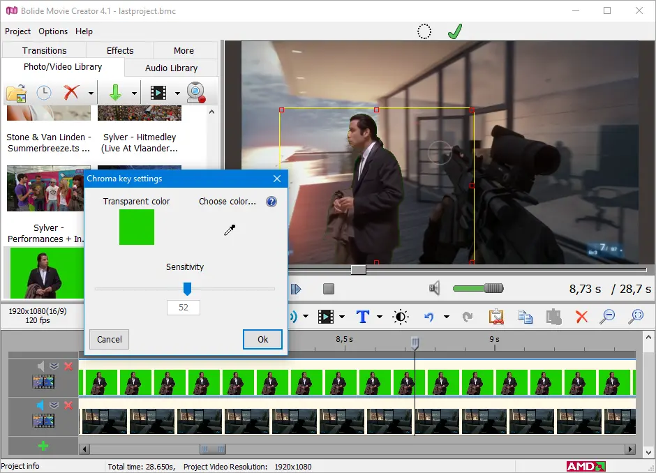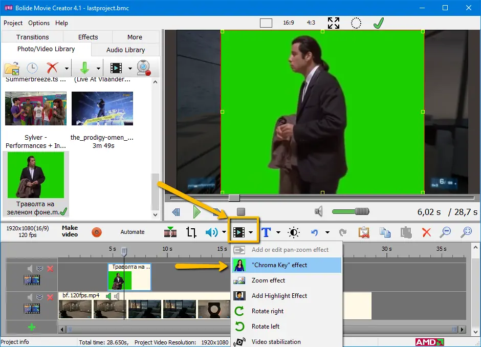 Bolide Movie Creator умеет заменять однотонный фон (не обязательно зелёный, но фон должен быть ровно освещён). В рабочем плане это выглядит так: