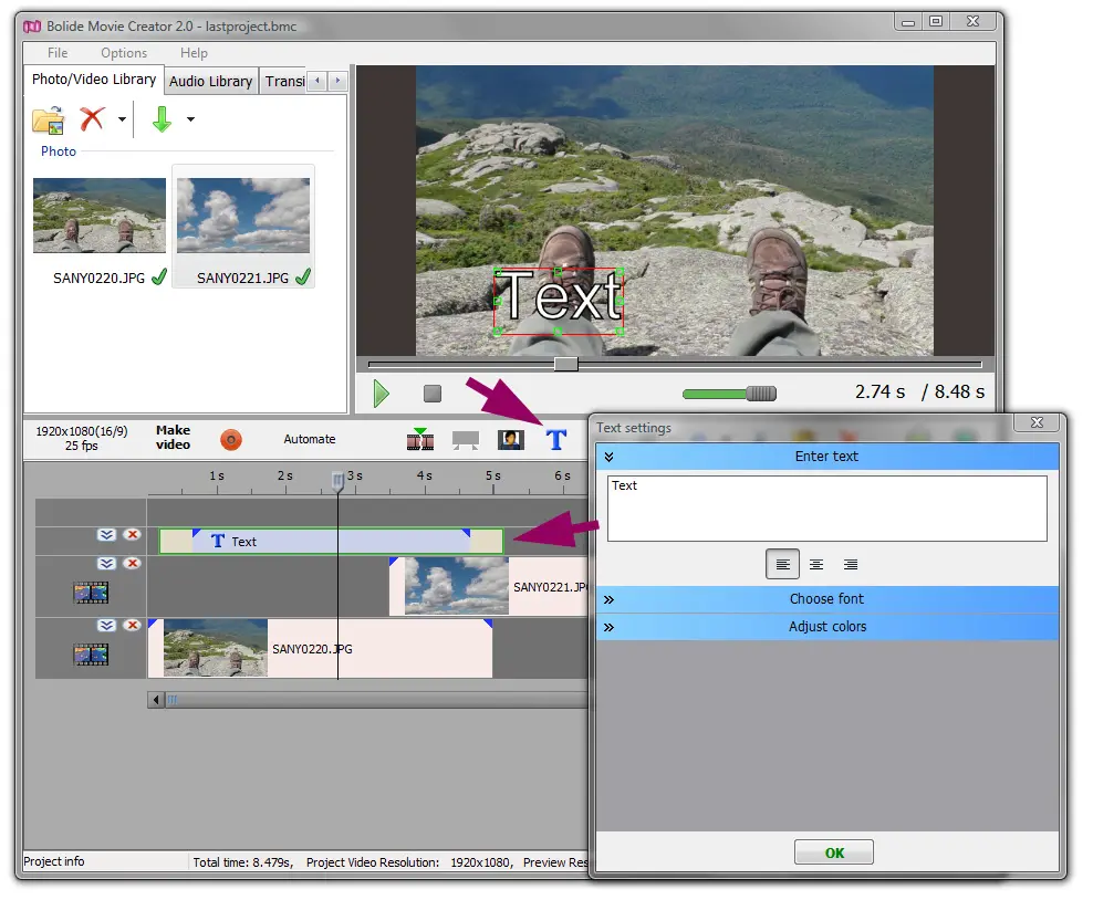 Нажмите синюю кнопку T на главной панели — откроется окно Text settings, а сверху по стеку дорожек появится отдельная текстовая дорожка и небольшой текстовый клип.
