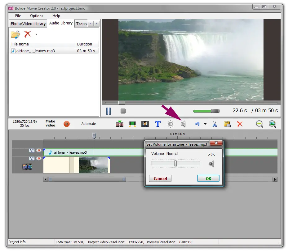 Затем перетащите трек на таймлайн (обычно на отдельную аудиодорожку). Чтобы отрегулировать громкость: