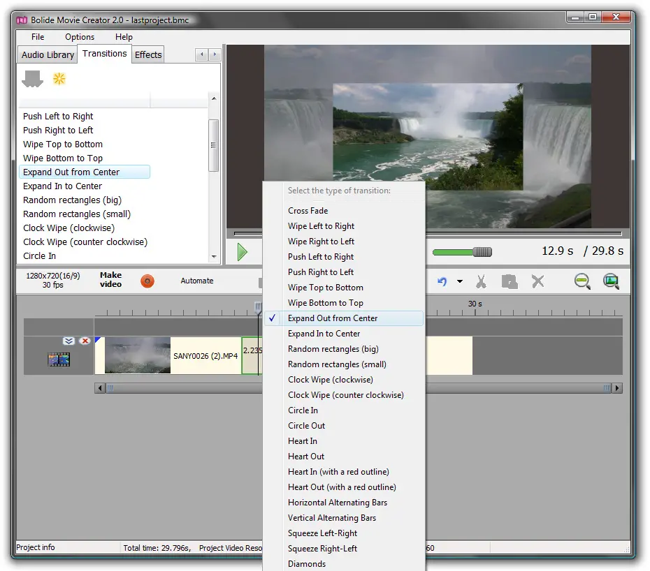 В Bolide Movie Creator переход работает через небольшое перекрытие двух клипов: конец первого заходит на начало второго. Перекрытая область подсвечивается — это место, где выбирается transition.