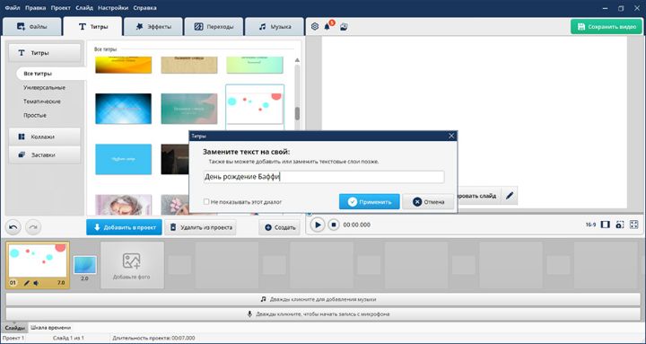 В программе есть и готовые шаблоны титров, и возможность собрать собственный текстовый слайд. Для этого можно использовать вкладку Титры на основном экране или добавить текст как слой внутри редактора конкретного кадра. Второй вариант особенно полезен, когда текст должен жить не сам по себе, а быть частью сцены — например, появляться поверх фотографии, выезжать снизу, слегка поворачиваться, растворяться, сопровождаться клипартом или находиться в определенной области кадра.