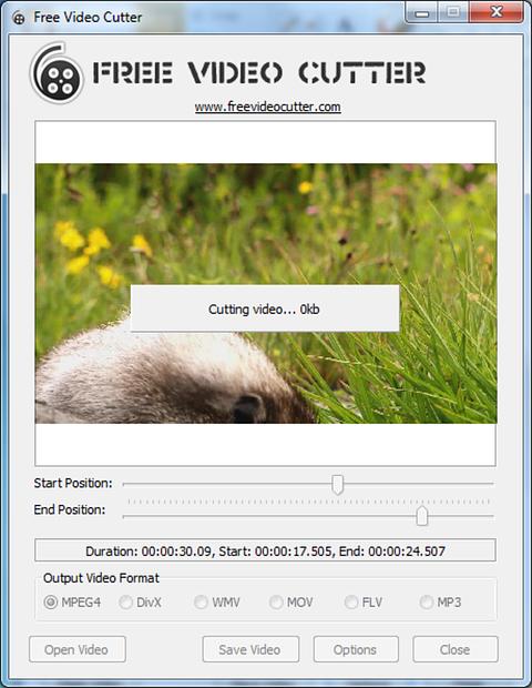 Главное окно Free Video Cutter построено вокруг нескольких крупных блоков. Сверху расположена большая область предпросмотра, в которой отображается текущий кадр или последовательность кадров из открытого ролика. Ниже находятся две горизонтальные шкалы: Start Position и End Position. Они отвечают за выбор начальной и конечной точки вырезаемого фрагмента. Ещё ниже программа выводит строку с длительностью выбранного диапазона и точными значениями начала и конца. Под этой строкой располагается секция Output Video Format, где переключателями выбирается формат сохранения. В самом низу вынесены основные команды: Open Video, Save Video, Options, Close.
