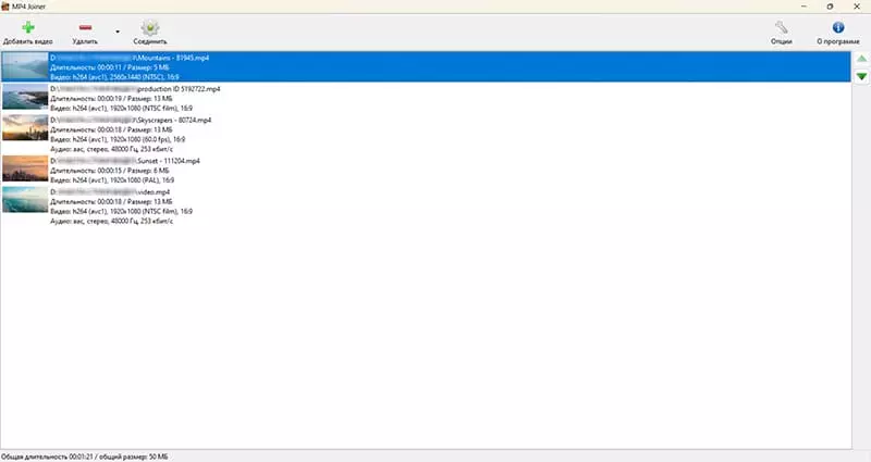 В списке файлов MP4Joiner показывает не только имена клипов. Для каждого элемента видны путь, длительность, размер, параметры видео, разрешение, соотношение сторон и аудиоданные. Это важный момент, потому что программа с самого начала подталкивает не просто к механической склейке, а к проверке совместимости роликов. Когда перед объединением видно, что один фрагмент имеет другое разрешение, другое соотношение сторон или иные параметры звука, становится понятнее, откуда потом могут взяться проблемы на этапе сохранения или почему придется включать перекодирование.
