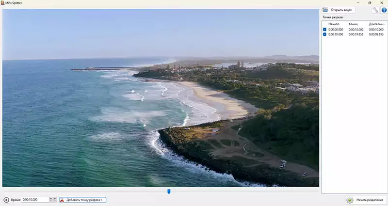 Сильная сторона MP4Splitter в том, что он визуализирует результат до запуска обработки. После добавления нескольких точек сразу видно, как именно разложится ролик, какие отрезки получатся и где проходят границы каждого куска. Такой формат особенно удобен для длинных видео, где легко запутаться в ручном расчете интервалов. Вместо абстрактной схемы пользователь получает список стартов, концов и длительностей, а значит, может спокойно проверить логику нарезки до того, как начнет сохранение.
