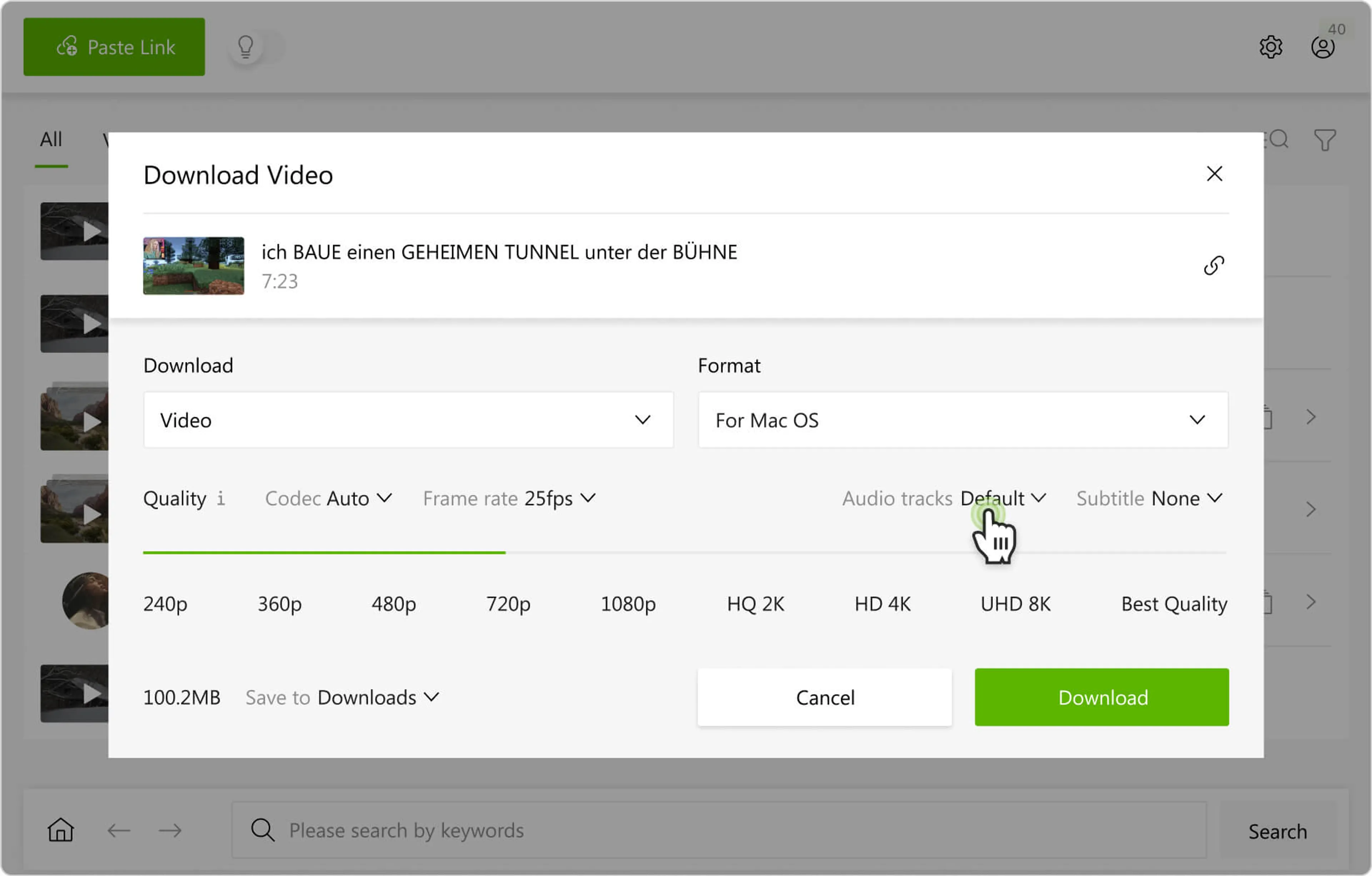 Структура окна удачная потому, что логика чтения интерфейса полностью совпадает с логикой действия. Пользователь сначала решает, что скачивает — Video или Audio, затем выбирает Quality, потом Format, затем папку Save To, после чего нажимает Paste Link. В Smart Mode на этом все и заканчивается: ссылка вставляется, и программа сразу начинает скачивание с уже сохраненными параметрами. В ручном режиме после вставки открывается отдельное окно настроек конкретной загрузки.