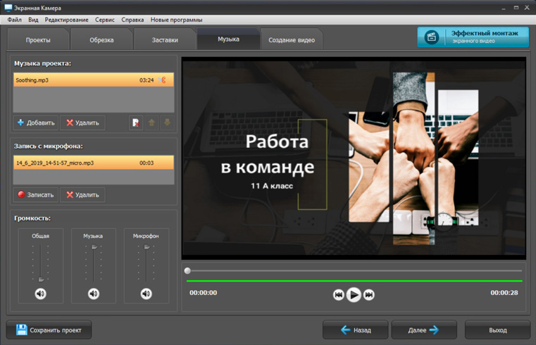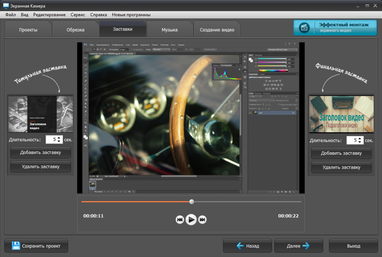 Здесь заметно сильнее блок работы с уже записанным материалом. Вкладки Обрезка, Заставки, Музыка и Создание видео делают программу не просто рекордером, а законченной средой для подготовки экранного ролика. Поэтому для тех, кто делает обучающие видео и инструкции, Экранная Камера обычно практичнее.