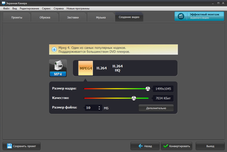 | Экспорт в форматы | Вкладка Создание видео | MP4, MPEG4, H.264, AVI, MOV, MKV и другие сценарии сохранения |