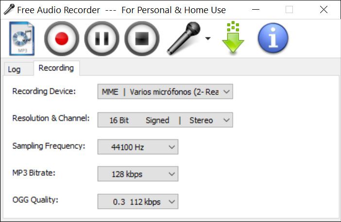 После первого запуска программа открывается маленьким окном с классическим верхним блоком управления и двумя основными вкладками: Log и Recording. Уже здесь видно ключевое достоинство Free Audio Recorder: интерфейс не требует расшифровки. Пользователь буквально с первого экрана понимает, где включается запись, где ставится пауза, где останавливается сеанс и где задаются параметры качества. Именно в этом и состоит философия приложения — не обучать, а сразу записывать.