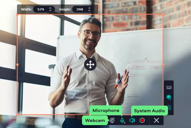 Это базовый режим программы. Пользователь нажимает Screen recording, выделяет мышью область захвата и получает рабочую рамку записи. Можно захватывать как весь экран, так и фрагмент: окно приложения, кусок браузера, рабочую область редактора, интерфейс CRM, таблицу, презентацию или отдельную часть вебинара. Для инструкций и обучающих роликов именно произвольная область чаще всего удобнее полного экрана, потому что в финальном видео не остается лишнего.