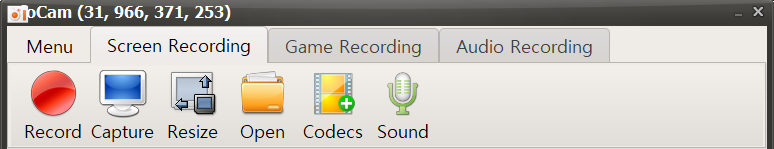 У oCam классическая для Windows-утилит компоновка: в верхней части — вкладки режимов, ниже — крупные кнопки действий. В обычном режиме пользователь видит вкладки Screen Recording, Game Recording и Audio Recording, а также блок кнопок Record, Capture, Resize, Open, Codecs и Sound. Уже на этой панели видно, как разработчики задумывали сценарии использования: запись видео, снятие скриншотов, выбор области, доступ к сохраненным файлам, настройка контейнера и кодека, а также управление источниками звука.