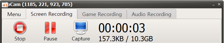 Когда запись уже идет, интерфейс меняется: кнопка Record превращается в Stop, появляется Pause, остается доступной Capture, а в окне отображаются длительность текущей записи, размер записываемого файла и свободное место на диске. Это полезная деталь. В oCam не нужно гадать, сколько уже заняло видео и не закончится ли место на накопителе в самый неудачный момент.