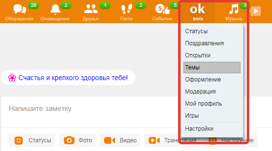 Утром пользователь открывает Одноклассники и видит привычный интерфейс, но уже с дополнительным меню OkTools. Через него можно быстро перейти в Темы, если нужно изменить оформление страницы, или в Поздравления, если предстоит отправить сообщение к празднику. Возле поля ввода сообщений уже доступны быстрые кнопки для поздравлений, файлов и голосового ввода.