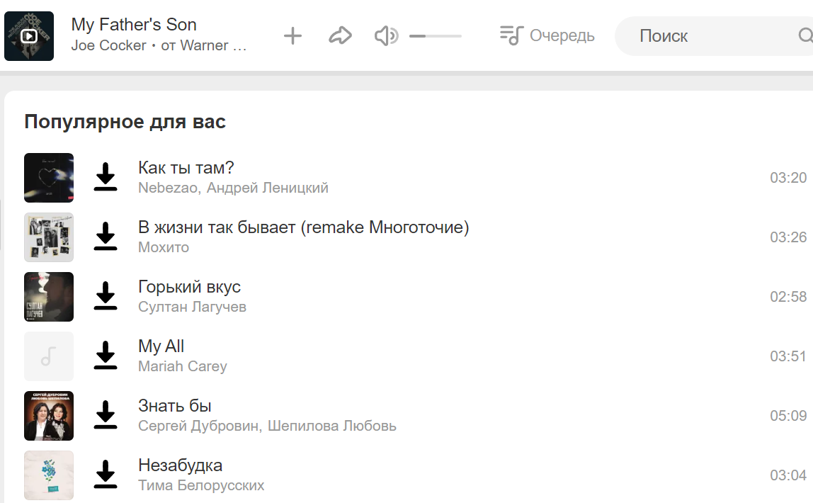 Дальше пользователь переходит в музыку. Рядом с каждым треком уже есть кнопка СКАЧАТЬ, при наведении видно размер и битрейт. Треки можно сохранять по одному, сразу сортируя их по папкам. После загрузки файл помечается, и расширение подсказывает, что его уже скачали.