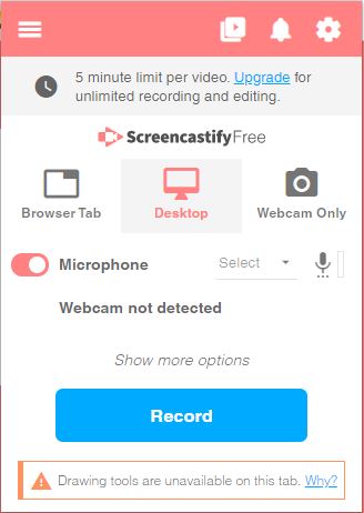Нажмите на иконку Screencastify в панели расширений Chrome. Откроется Recording Control Panel. Здесь выбирается режим записи, включаются микрофон и камера, задается Countdown и при необходимости включается Show Drawing Tools.