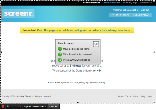 Пользователь заходил на Screenr, нажимал одну из кнопок Record, после чего открывалось окно записи. Далее нужно было настроить рамку захвата так, чтобы в нее попадал именно тот участок экрана, который требуется показать. Это мог быть интерфейс программы, браузер, фрагмент документа, область настроек или отдельное окно приложения. Затем запускалась запись, и сервис начинал захватывать действия на экране вместе с голосовым комментарием с микрофона.