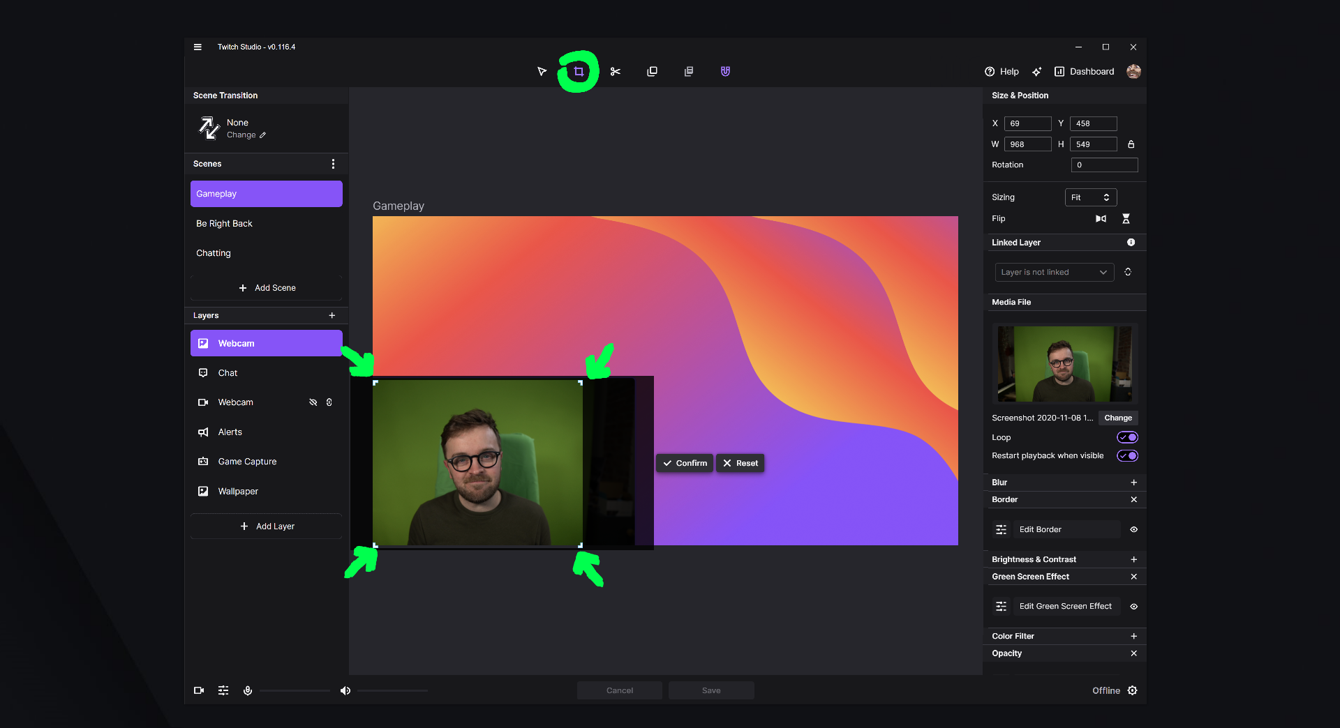 Отдельного внимания заслуживает кадрирование. В редакторе сцены Twitch Studio позволяет обрезать webcam через crop tool на верхней панели. Это мелочь, но на практике именно такие мелочи определяют, насколько удобно подгонять кадр под layout. Не всегда нужно показывать весь исходный поток с камеры: часто хочется убрать лишний фон, сместить лицо в кадре, изменить визуальный акцент. В Twitch Studio такая операция решается внутри редактора сцены и не ощущается как отдельная техническая процедура.