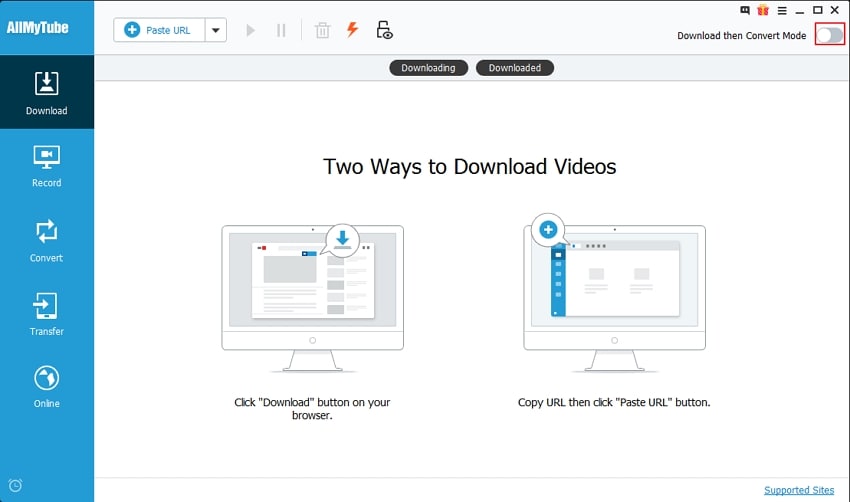 С первого запуска Wondershare AllMyTube показывает типичный десктопный интерфейс Wondershare: верхняя панель с основными действиями, рабочая область в центре и навигация по функциональным разделам. В Windows-версии базовая связка строится вокруг верхней кнопки + Paste URL, переключателя Download then Convert Mode, а также разделов Download, Record, Convert и Transfer. Внутри загрузочного блока дополнительно используются вкладки Downloading и Downloaded, чтобы разнести активные и завершенные задачи. По логике это очень рациональная структура: сначала ролик попадает в очередь, затем оседает в библиотеке, после чего его можно конвертировать, записать или передать на устройство.
